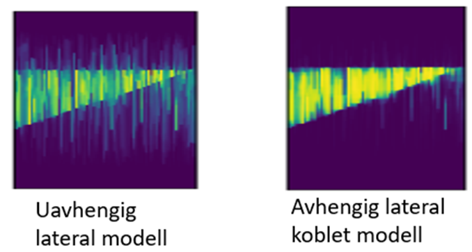 I Figur 2 sammenlignes sannsynligheten for sand gitt de seismiske dataene i Figur 1 ved bruk av en uavhengig lateral prior modell og en avhengig lateral koblet prior modell. En lateralt koblet prior modell gir i dette studiet et skarpere omriss av sandpakken og generelt høyere sannsynlighet for sand sammenlignet med en modell uten lateral kobling. En lateral modell er også mindre sensitiv for visuelle artefakter.